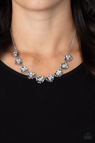 Heart-shaped silver petals bloom from opaque Spun Sugar rhinestone centers, creating colorful flowers. The dainty floral frames delicately dance below the collar, connecting into a whimsical centerpiece. Features an adjustable clasp closure.
