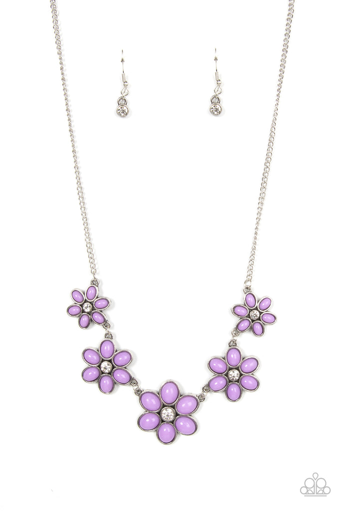 Dotted with dainty white rhinestone centers, a flirtatious assortment of purple beaded flowers gradually increase in size as they link below the collar for a playful pop of color. Features an adjustable clasp closure.
