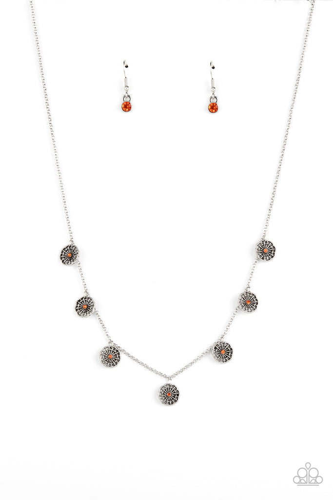 Whimsical antiqued silver floral medallions, dotted with dainty bright orange rhinestone centers, dangle from a petite silver chain resulting in a charming allure below the collar. Features an adjustable clasp closure.