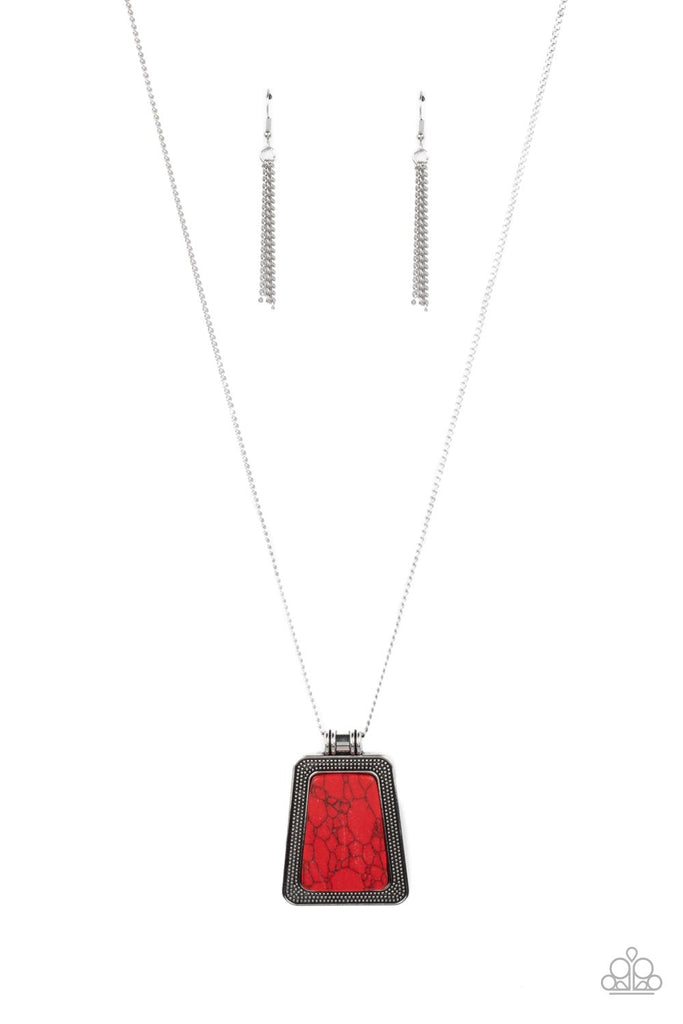 A flat and trapezoidal red stone is pressed into the center of a studded silver frame, resulting in a rustic pendant at the bottom of a lengthened silver chain. Features an adjustable clasp closure.