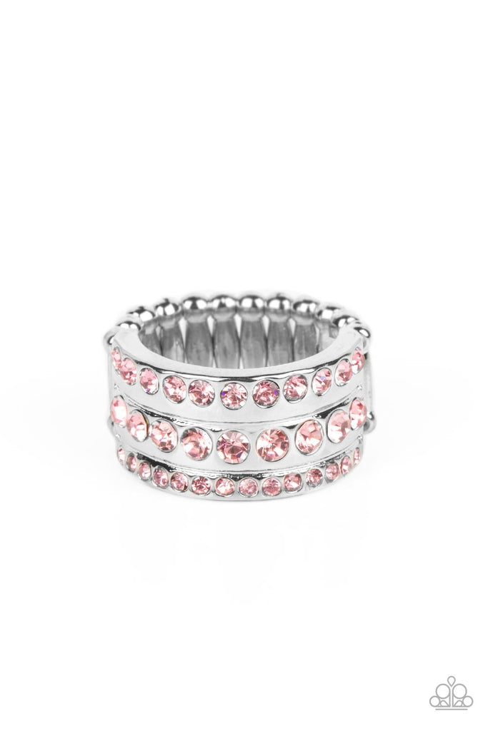 A thick band of high-sheen silver is topped with three rows of glittery light rose rhinestones, creating the illusion of three separate bands. The rhinestones gradually decrease in size from the centermost band, adding depth and dimension to the poised centerpiece. Features a stretchy band for a flexible fit.