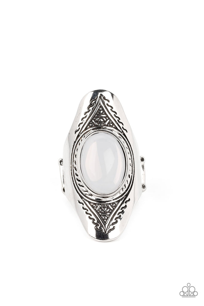 An oversized, glassy, opal bead is pressed into the center of a dramatically elongated silver frame. Triangular patterns are etched into the frame as it folds around the finger, resulting in an ethereal pop of color atop the finger. Features a stretchy band for a flexible fit.