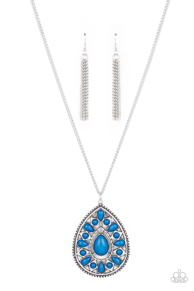 A dainty collection of round and teardrop French Blue beads flair out from an oversized teardrop bead across the front of an ornate frame. Embossed and cutout in geometric patterns, the tribal inspired pendant swings from the bottom of a lengthened silver chain for a dramatic pop of color. Features an adjustable clasp closure.