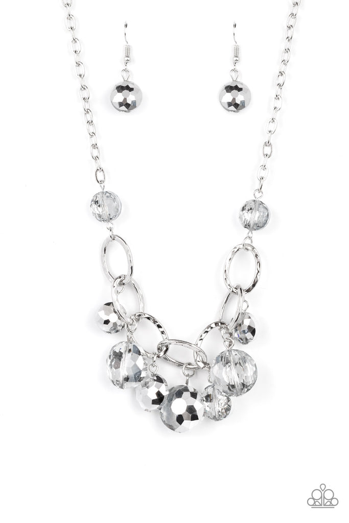 A collection of round, glassy silver beads in varying sizes swirl around shiny silver oval links hammered in texture. The beveled shape and faceted surfaces of the beads are brushed in a subtle reflective glaze, creating a dreamy display as they drip below the collar. Features an adjustable clasp closure.