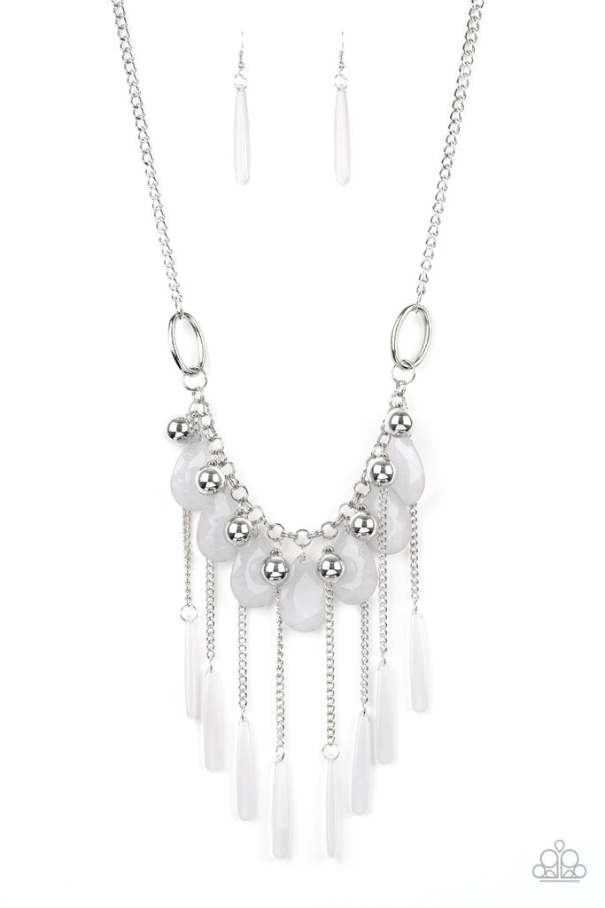 Shiny silver beads and faceted cloudy teardrops drip from the bottom of a shimmery silver chain below the collar. Flared cloudy beading swings from the bottoms of free-falling silver chains, creating a vivacious fringe. Features an adjustable clasp closure.