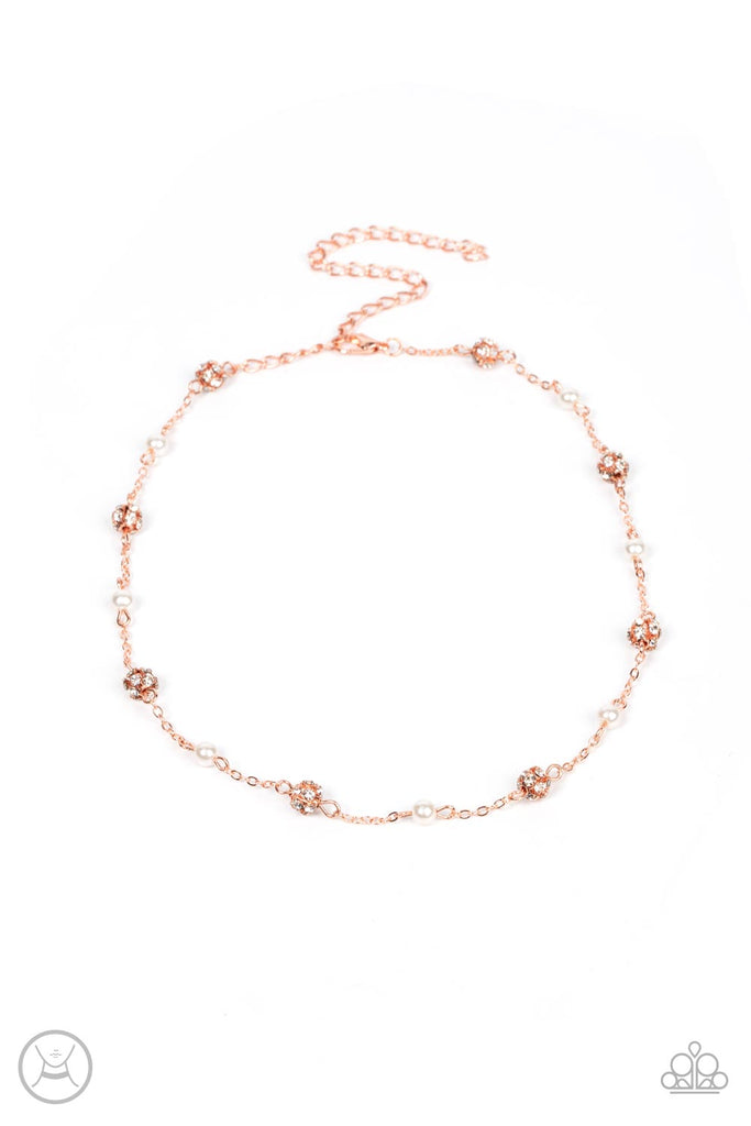 A dainty shiny copper chain dotted in bubbly white pearls and glitzy white rhinestone encrusted beads delicately connects around the neck, resulting in a timeless fashion. Features an adjustable clasp closure.