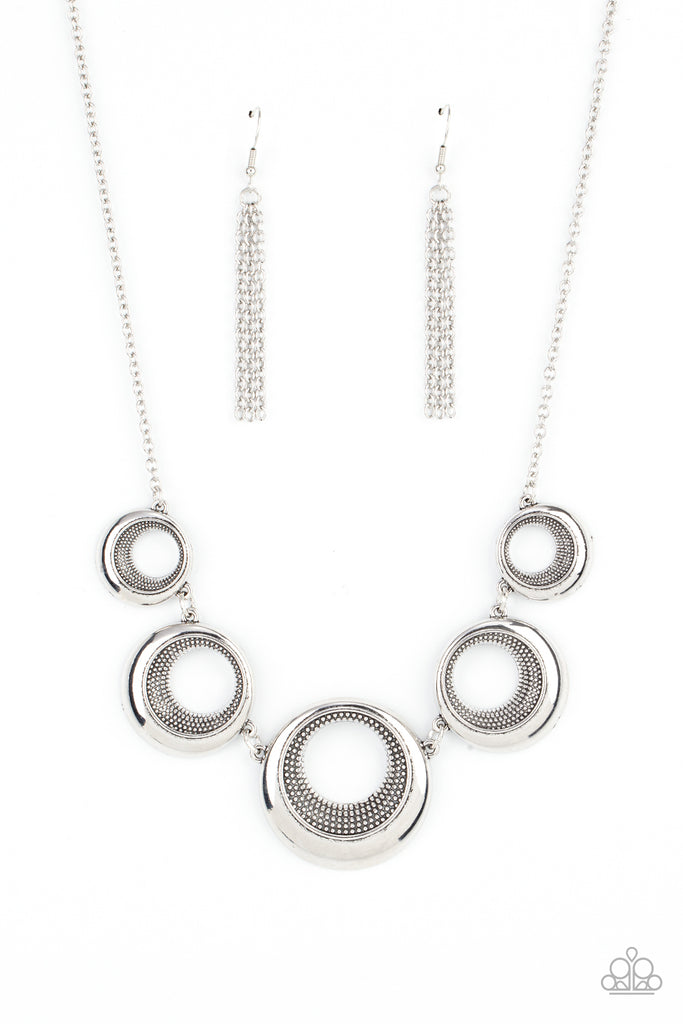 Featuring studded centers, a shiny collection of beveled hoops gradually increase in size as they link below the collar for a bold metallic look. Features an adjustable clasp closure.