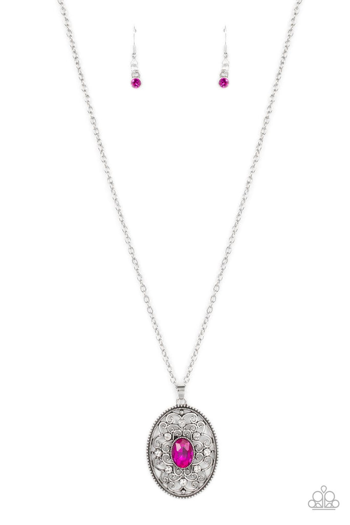 Dainty white rhinestones are sprinkled across silver vine-like filigree that whirls around an oval pink gem center inside of a studded silver frame, resulting in a whimsical pendant at the bottom of a silver chain. Features an adjustable clasp closure.