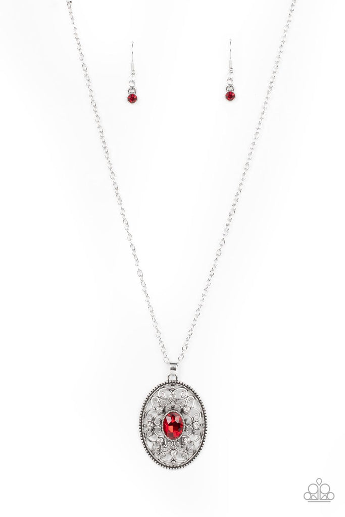 Dainty white rhinestones are sprinkled across silver vine-like filigree that whirls around an oval red gem center inside of a studded silver frame, resulting in a whimsical pendant at the bottom of a silver chain. Features an adjustable clasp closure.