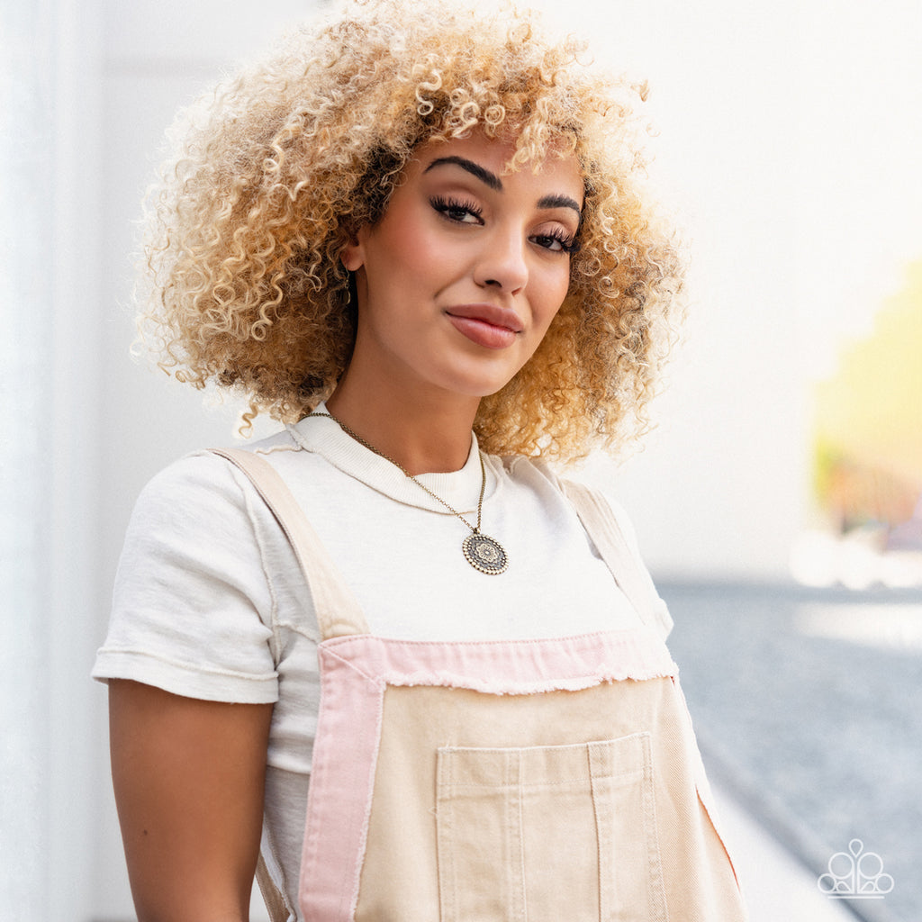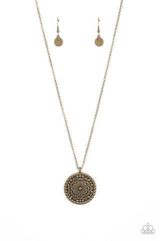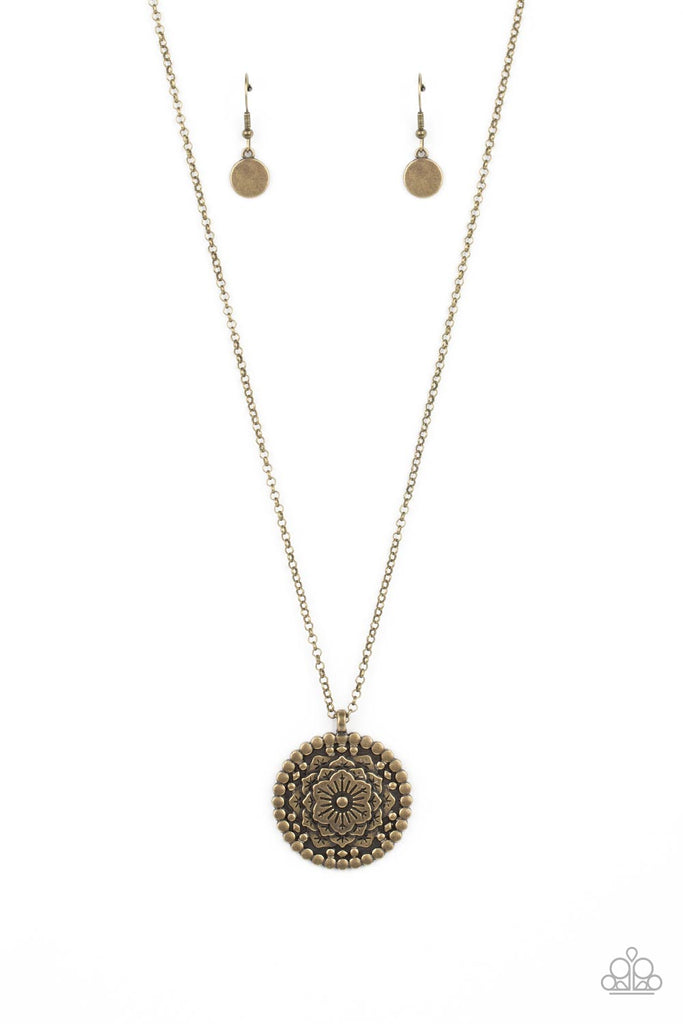 A circular brass disc is embellished with an intricate floral mandala motif. Tactile brass dots encircle the blooming flowers with an additional brass stud adorning the top of the design. Each petal is etched in detail, adding tactile texture to the piece. Features an adjustable clasp closure.