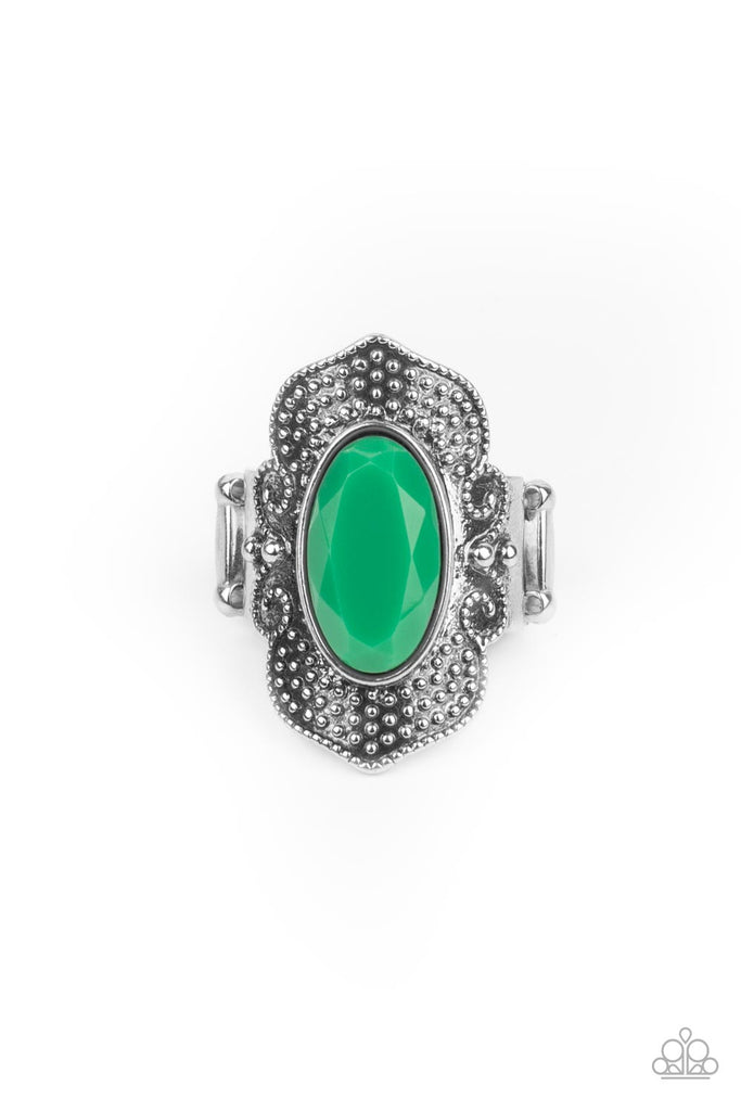A faceted oval Mint bead is pressed into the center of a scalloped silver frame dotted in dainty silver studs, creating a trendy centerpiece atop the finger. Features a stretchy band for a flexible fit.