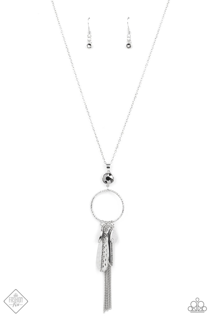Featuring both smooth and hammered finishes, dainty smoky rhinestones, and a tassel of dainty chains, a sassy collection of silver charms swings from the bottom of a brightly textured circle. A faceted hematite gem sits atop the harmoniously audacious display at the bottom of a lengthened dainty silver chain for a crowning finish. Features an adjustable clasp closure.