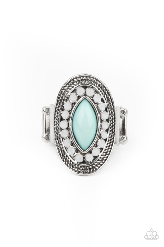 A silver frame embellished with dewy white beads and studded silver texture creates a stunning backdrop for a New Blue marquise cut bead as it sits atop the finger. Features a stretchy band for a flexible fit.