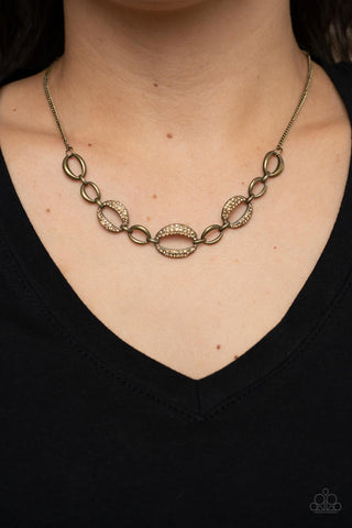 Three golden topaz rhinestone encrusted brass fames link with rustic brass ovals below the collar, resulting in a rustic refinement. Features an adjustable clasp closure.