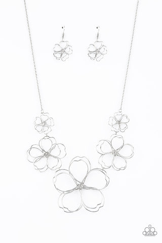 Glistening silver wire delicately twists into oversized blossoms. Gradually increasing in size, the 3D frames elegantly pop beneath the collar. Features an adjustable clasp closure.