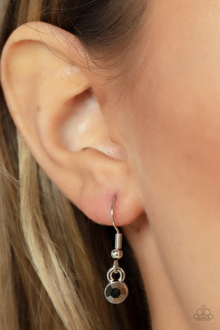 A smoky hematite rhinestone encrusted silver disc swings from the bottom of an oversized silver hoop fitting, creating a glamorously glitzy pendant at the bottom of an extended silver chain. Features an adjustable clasp closure.