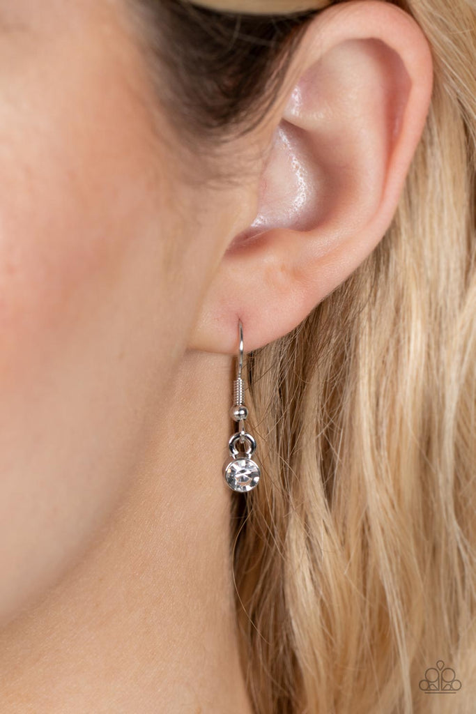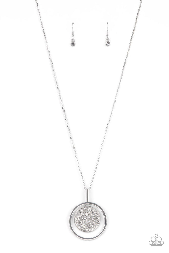 An icy white rhinestone encrusted silver disc swings from the bottom of an oversized silver hoop fitting, creating a glamorously glitzy pendant at the bottom of an extended silver chain. Features an adjustable clasp closure.