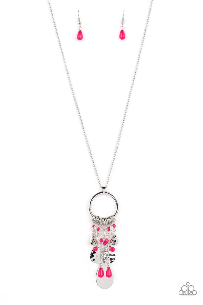 Separated by dainty silver rings, crystal-like beads in the shade of Pink Peacock stream from the bottom of a flat silver hoop. Gradually increasing in size, hammered silver teardrops add texture and shimmer to the design in a boisterous finish. Features an adjustable clasp closure.