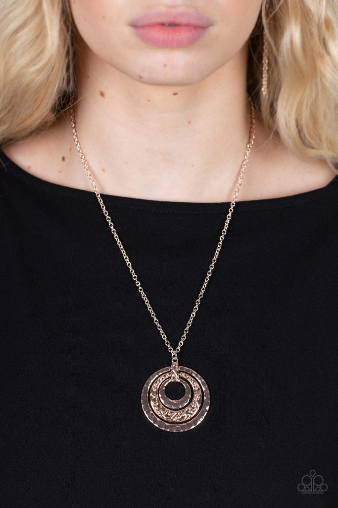 Infused with a vine-embossed rose gold fitting, a vine embossed rose gold hoop hangs between two hammered rose gold hoops at the bottom of a dainty rose gold chain for a dizzyingly demure look. Features an adjustable clasp closure.