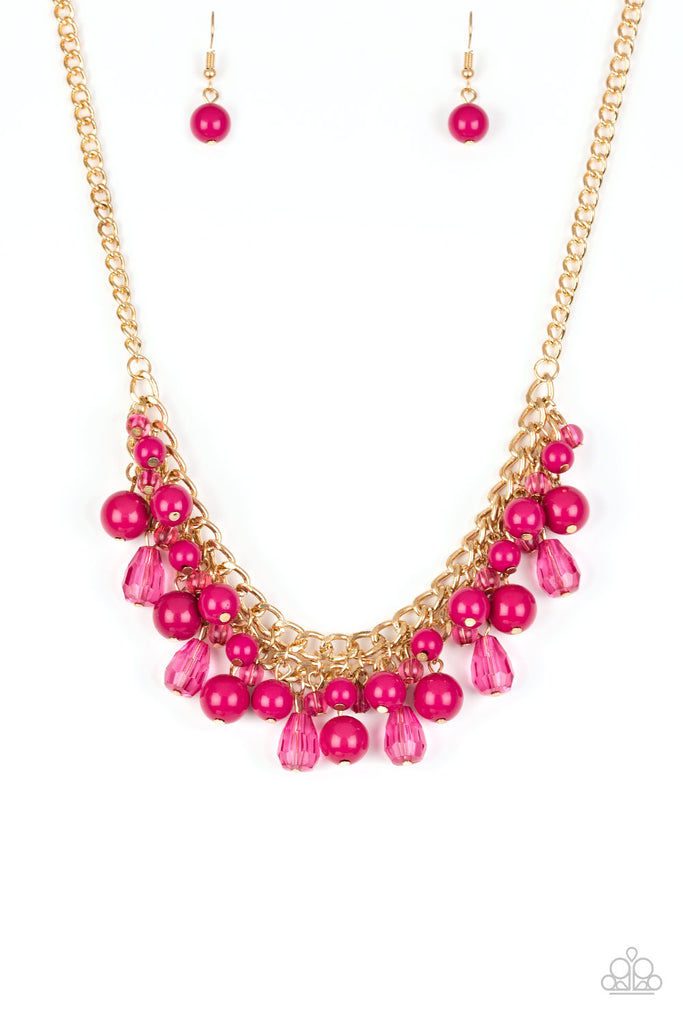 Varying in shape, glassy and polished pink beads swing from the bottom of interlocking gold chains. Crystal-like teardrops are sprinkled along the colorful beading, creating a flirtatious fringe below the collar. Features an adjustable clasp closure.