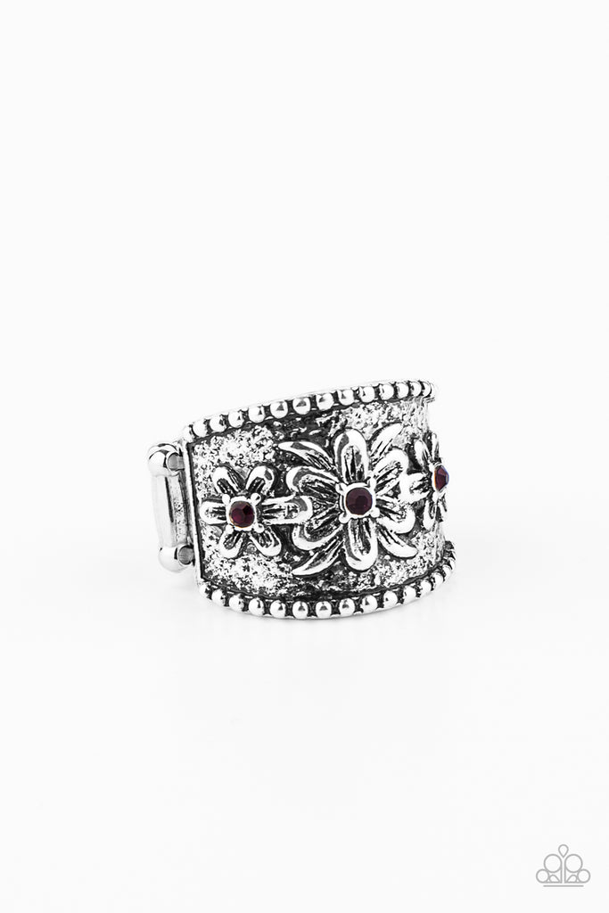 Dotted with dainty Magenta Purple rhinestone centers, tropical inspired flowers are embossed across the front of an antiqued studded silver band for a whimsical display. Features a stretchy band for a flexible fit.