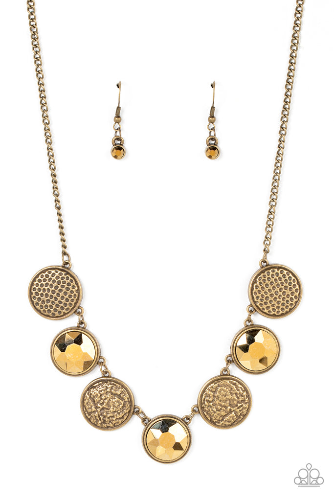 A gritty collection of hammered brass frames, oversized aurum rhinestones, and brass foiled-like frames delicately links below the collar, creating a sassy display of shimmer. Features an adjustable clasp closure.