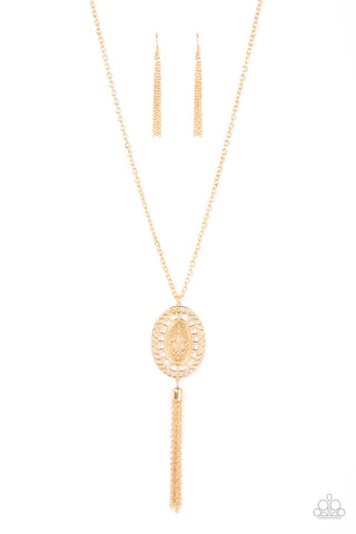A glistening gold chain tassel dances from an oval mandala-like frame at the bottom of an extended gold chain, resulting in a whimsical pendant. Features an adjustable clasp closure.